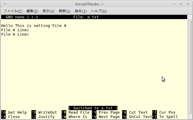 nano エディタで複数ファイルを同時編集、ファイル間のカットアンドペースト